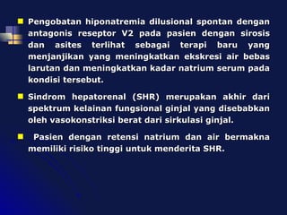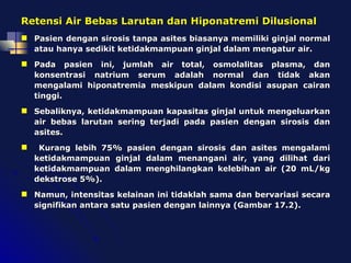 Klasifikasi Hiponatremia Walaupun differential diagnosisnya cukup luas hiponatremi bisa dibedakan menjadi beberapa kelompok menurut etiologinya. 1821 Larutan pengganti yang diberikan adalah natrium hipertonik bisa berupa NaCl 3 atau 5 NaCl. Hiponatremia dapat diterapi secara akut dengan pemberian larutan salin intravena dengan hati-hati agar tidak terjadi beban cairan pada pasien yang mungkin mengalami penurunan kemampuan mengeksresi urin.